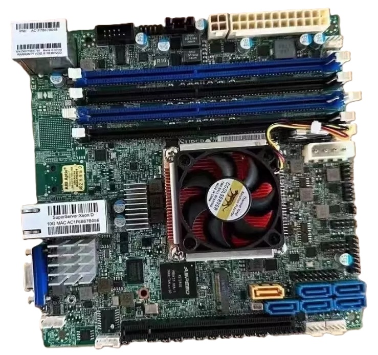 Supermicro X10SDV-F Intel Xeon D-1541 PCIe x16 1Gbe m.2 IPMI ITX DDR4 Server  - onboard Intel Xeon D-1541 8 Core / 16 Threads / 45W (passiv gekühlt)- 4 x DDR4 Ram Reg ECC bis 128GB - 1x PCIe x16 3.0 - 2x Intel LAN 1GBe - 6x SATA (1x SATADom kompatibel) - m.2 Slot - IPMI